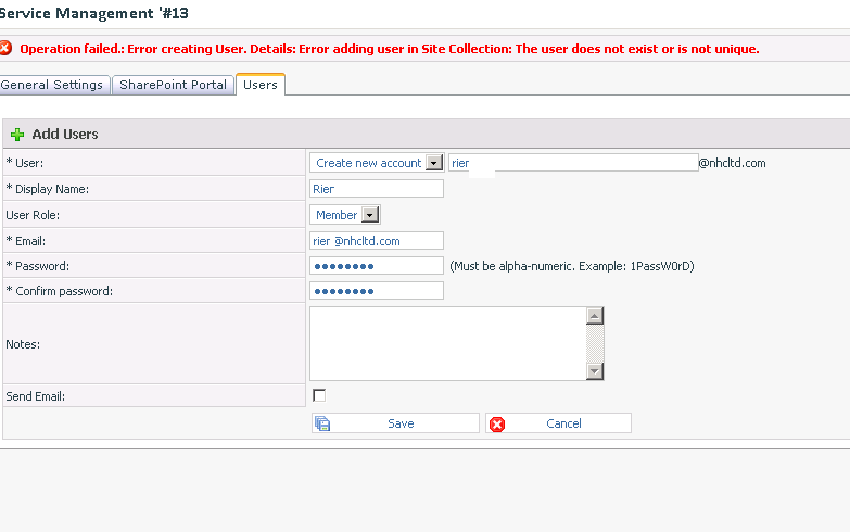 Failed: Error Creating User. Details: Error Adding User in Site